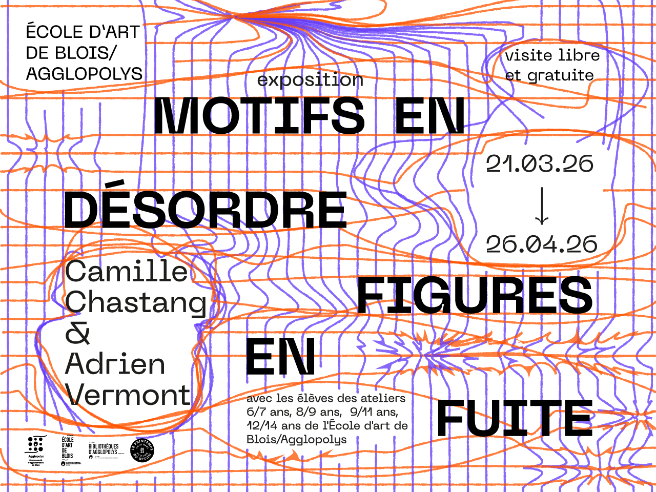 Dans le cadre du Festival national le Printemps du Dessin, nous avons le plaisir d’inviter les artistes Camille Chastang et Adrien Vermont à participer à un projet qui s’articule autour de plusieurs temps forts : deux workshops destinés aux élèves de l’École d’art de Blois/ Agglopolys, une conversation publique, et une exposition finale à l’espace Angelier de la bibliothèque Abbé Grégoire de Blois et à la médiathèque Maurice Genevoix de Blois, où les travaux réalisés lors du workshop dialogueront avec les œuvres des artistes invités. Vous découvrirez une exploration du dessin, où motifs et figures s’émancipent des codes traditionnels.